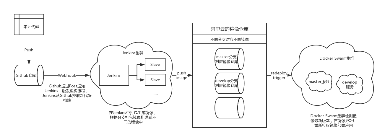 使用阿里云的镜像仓库和Docker Swarm搭建服务(适用于中小型企业)的流程基本上如上图所示。Jenkins根据分支选择条件将打包的镜像推送到对应的镜像仓库,设置推送镜像自动触发构建,Docker Swarm就拉取镜像构建了。ps.阿里云的镜像仓库和Docker Swarm之间可以走内网,省一些流量费用。